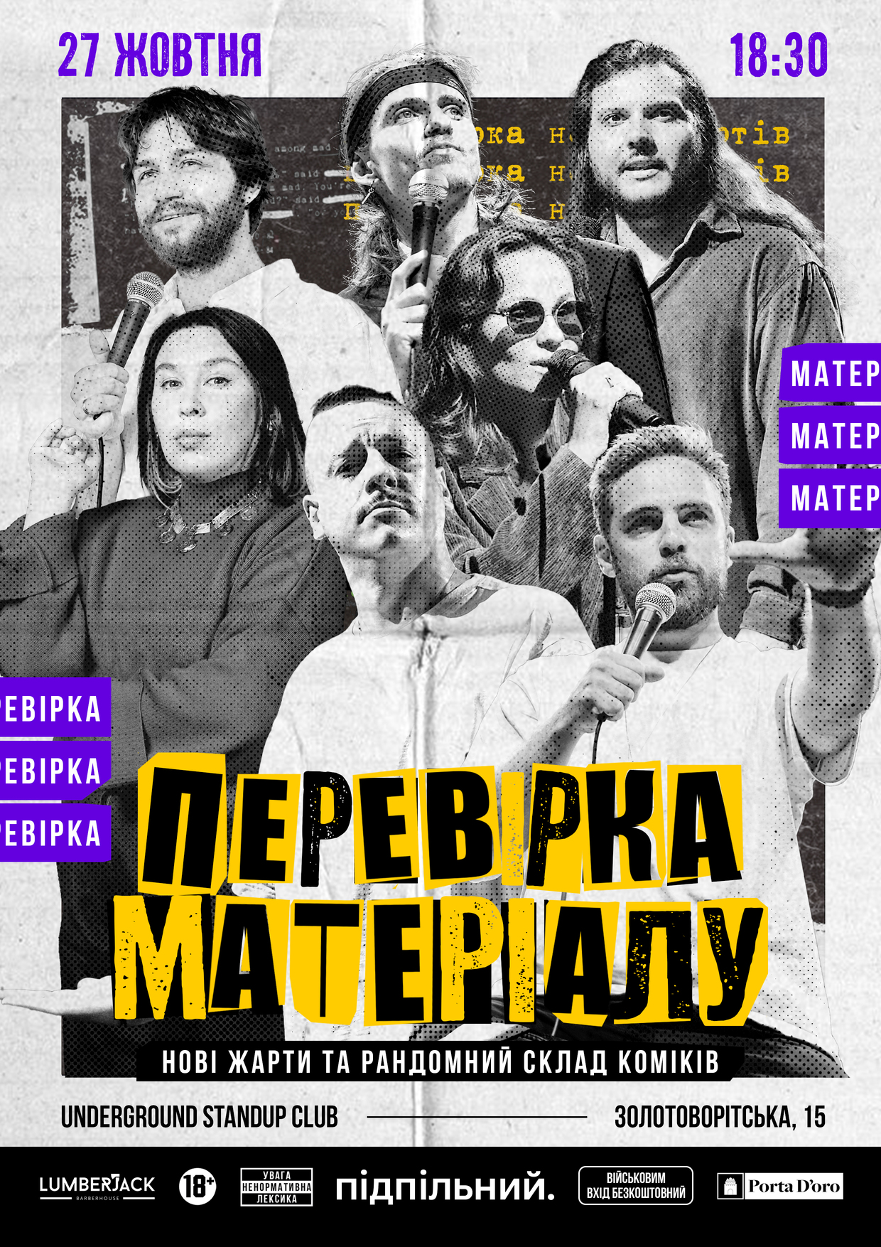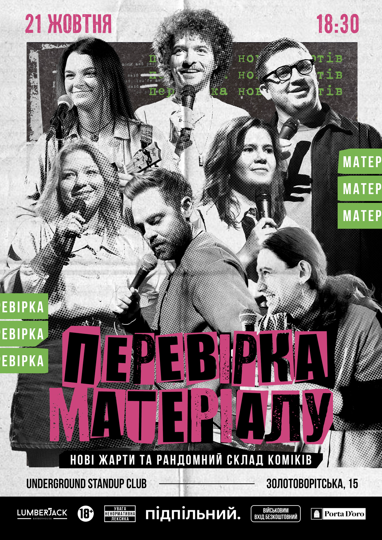 У «Підпільний Стендап» виступають топові коміки України. Але й у них жарти іноді повторюються. Радимо розглядати різні формати шоу та приходити на улюблених коміків кожного місяця. За новими жартами приходьте на концерти формату «Перевірка матеріалу»