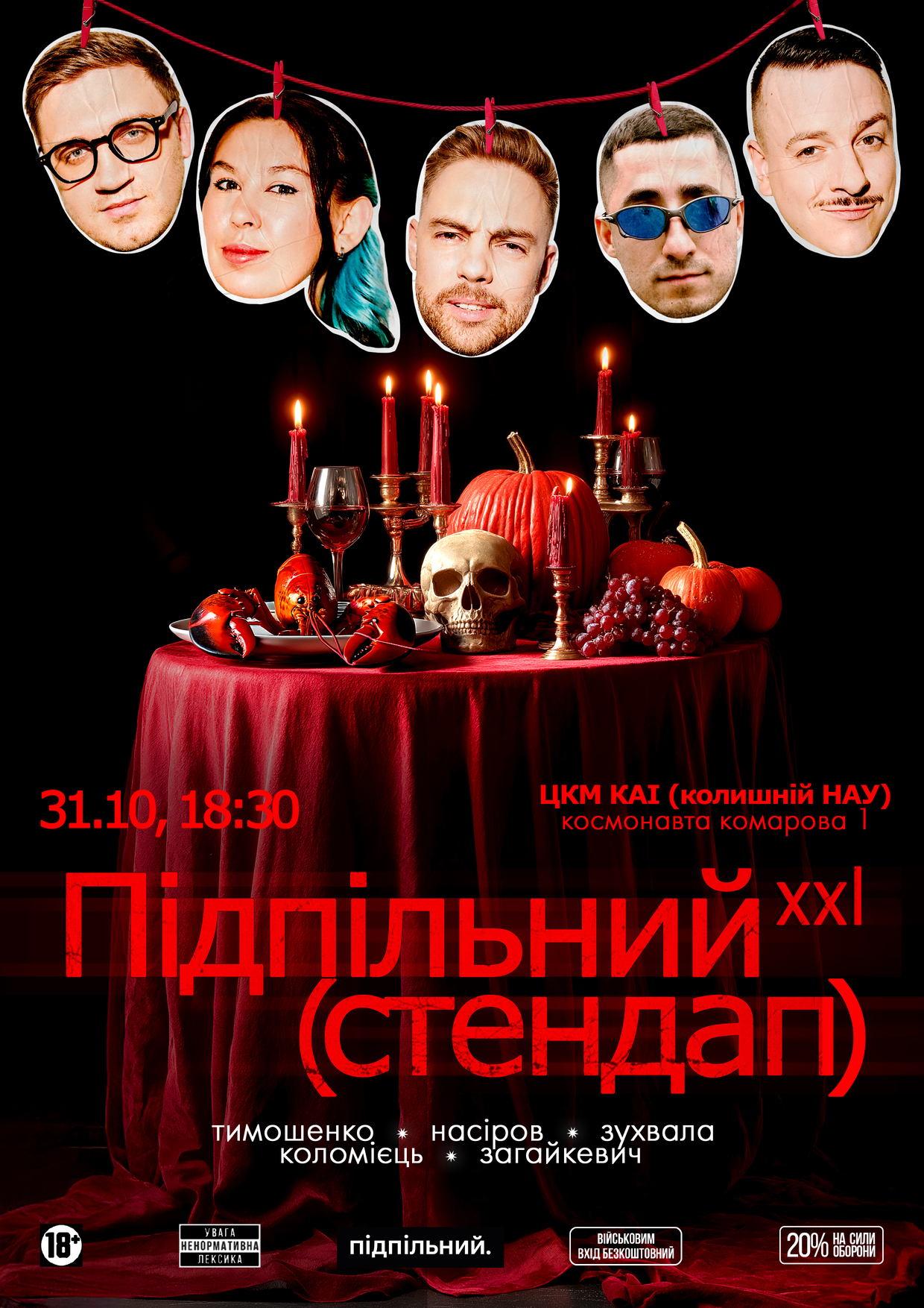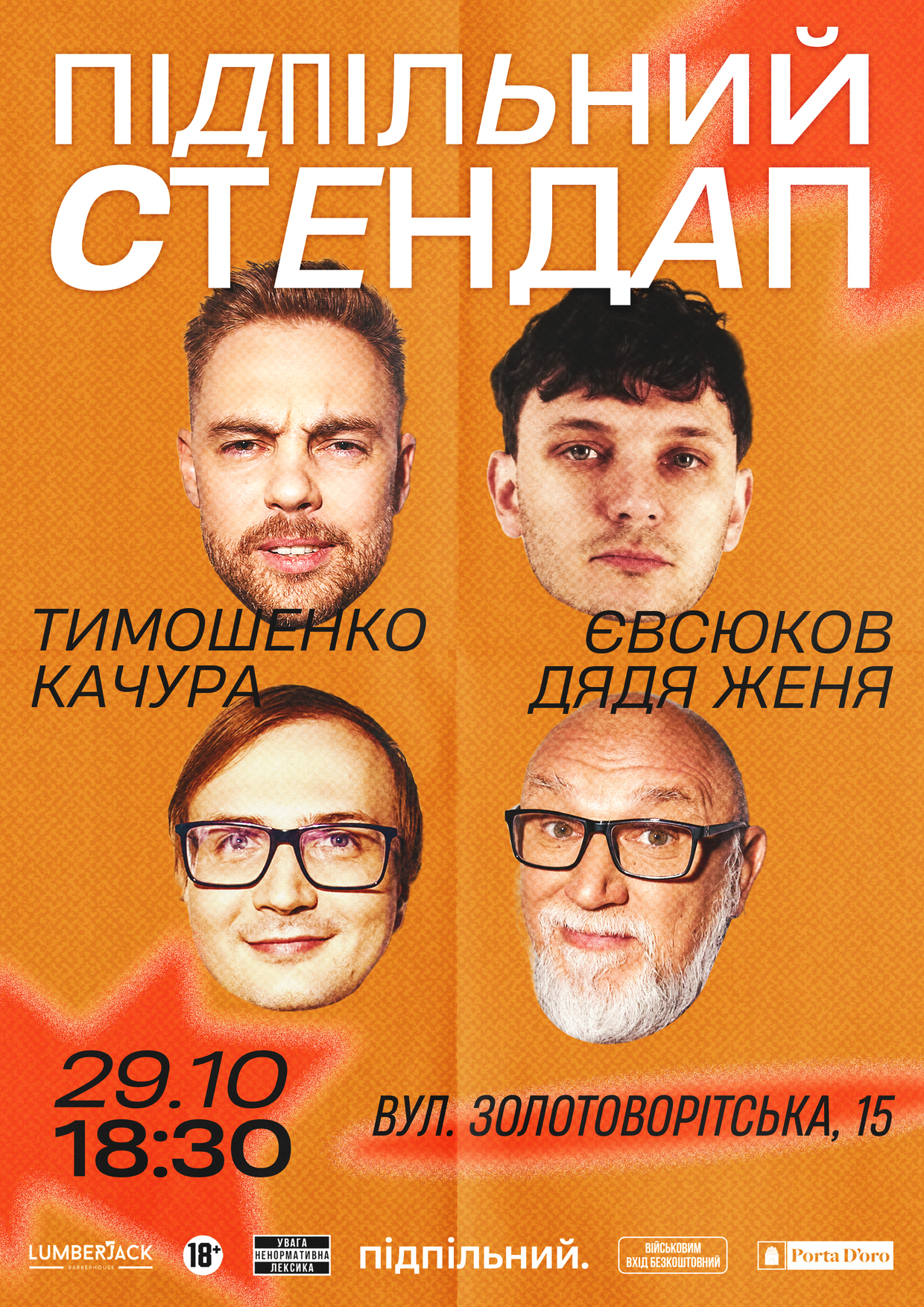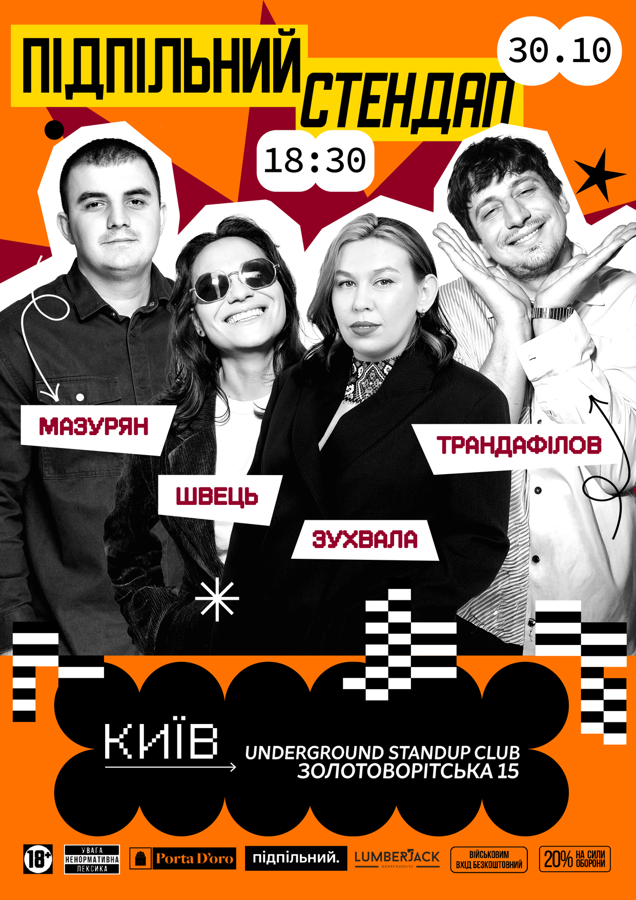 Підпільний Стендап має свій підхід до комедії. Особливі локації та формати, ексклюзивний матеріал від українських стендап коміків, що «не покажуть по ТБ».  З кожного концерту передаємо від 20% на потреби ЗСУ та влаштовуємо благодійні заходи.