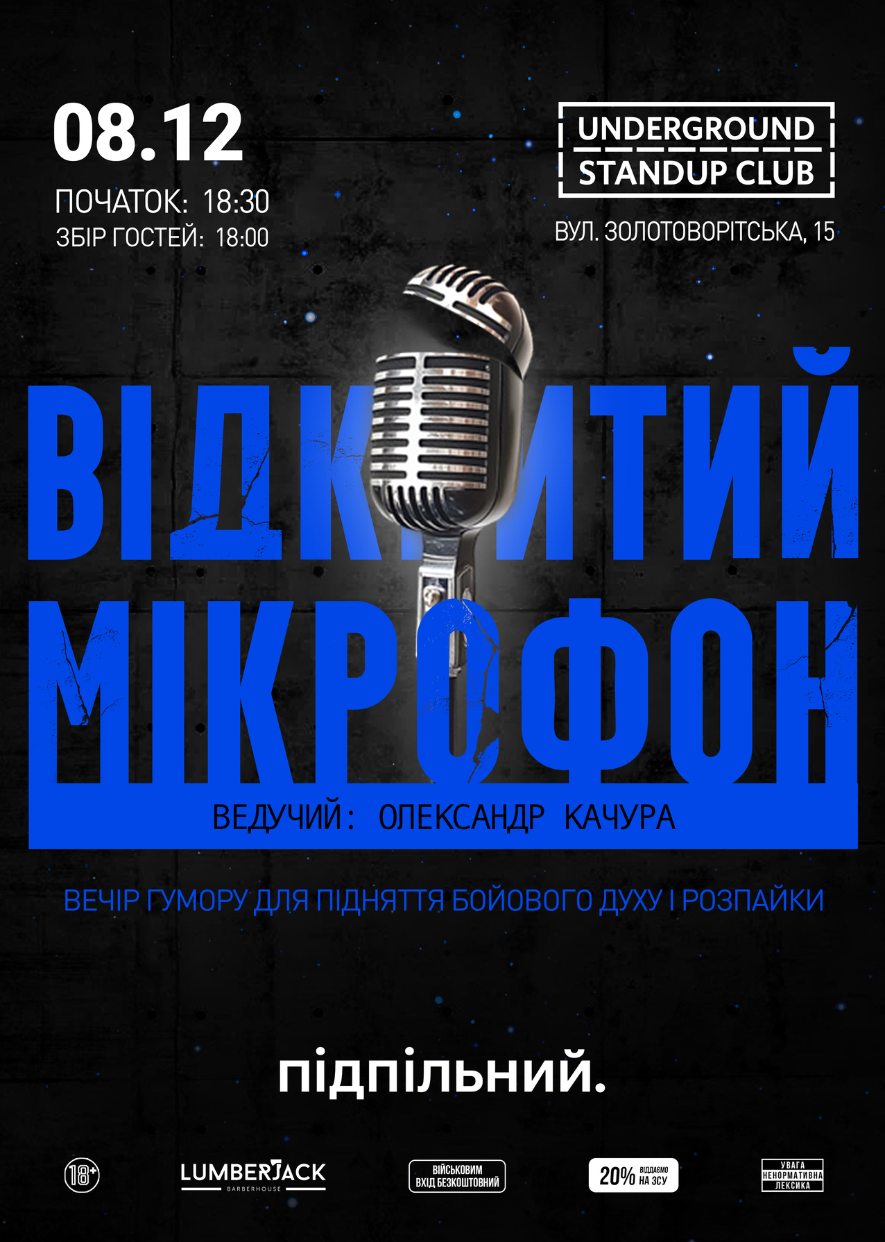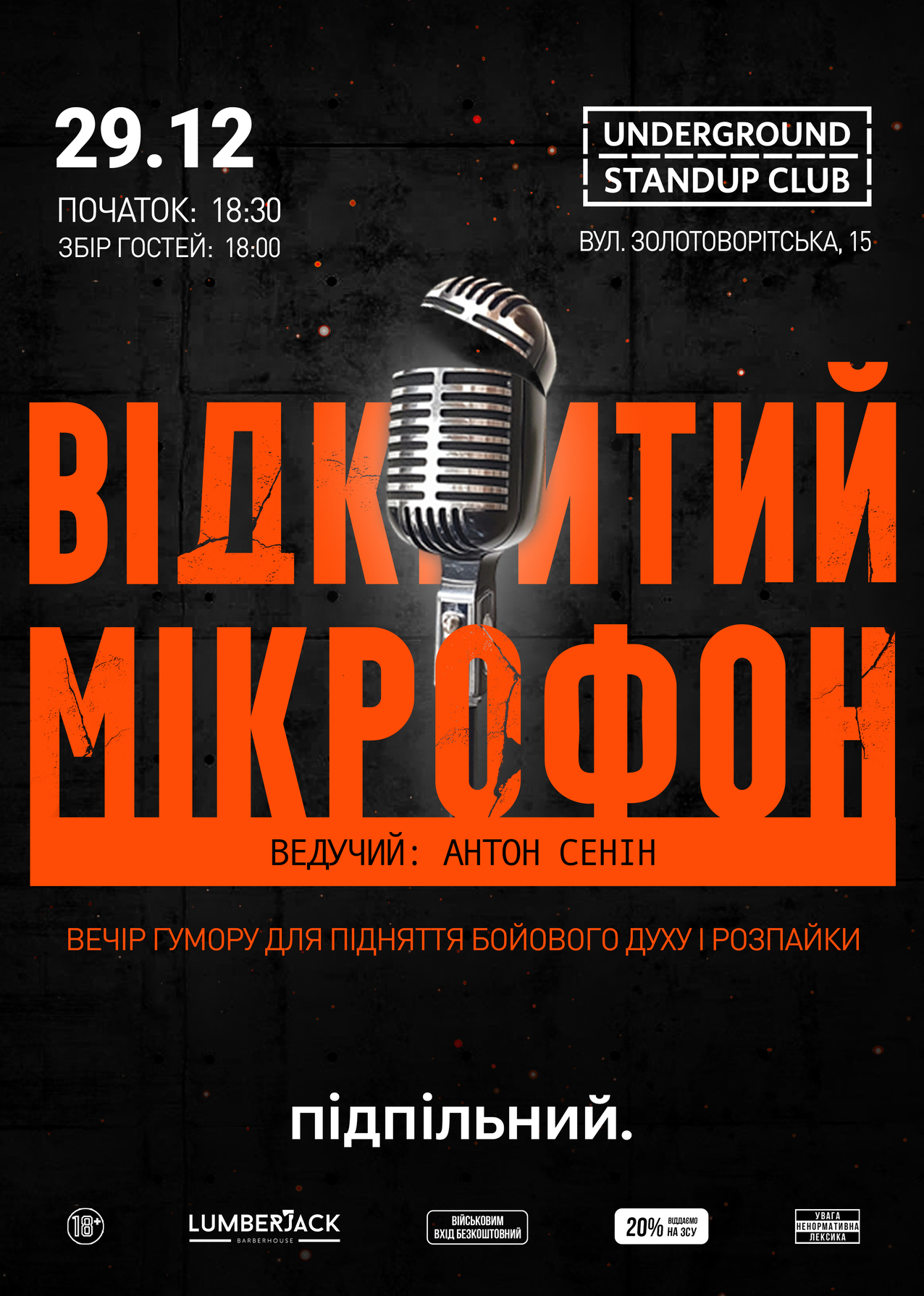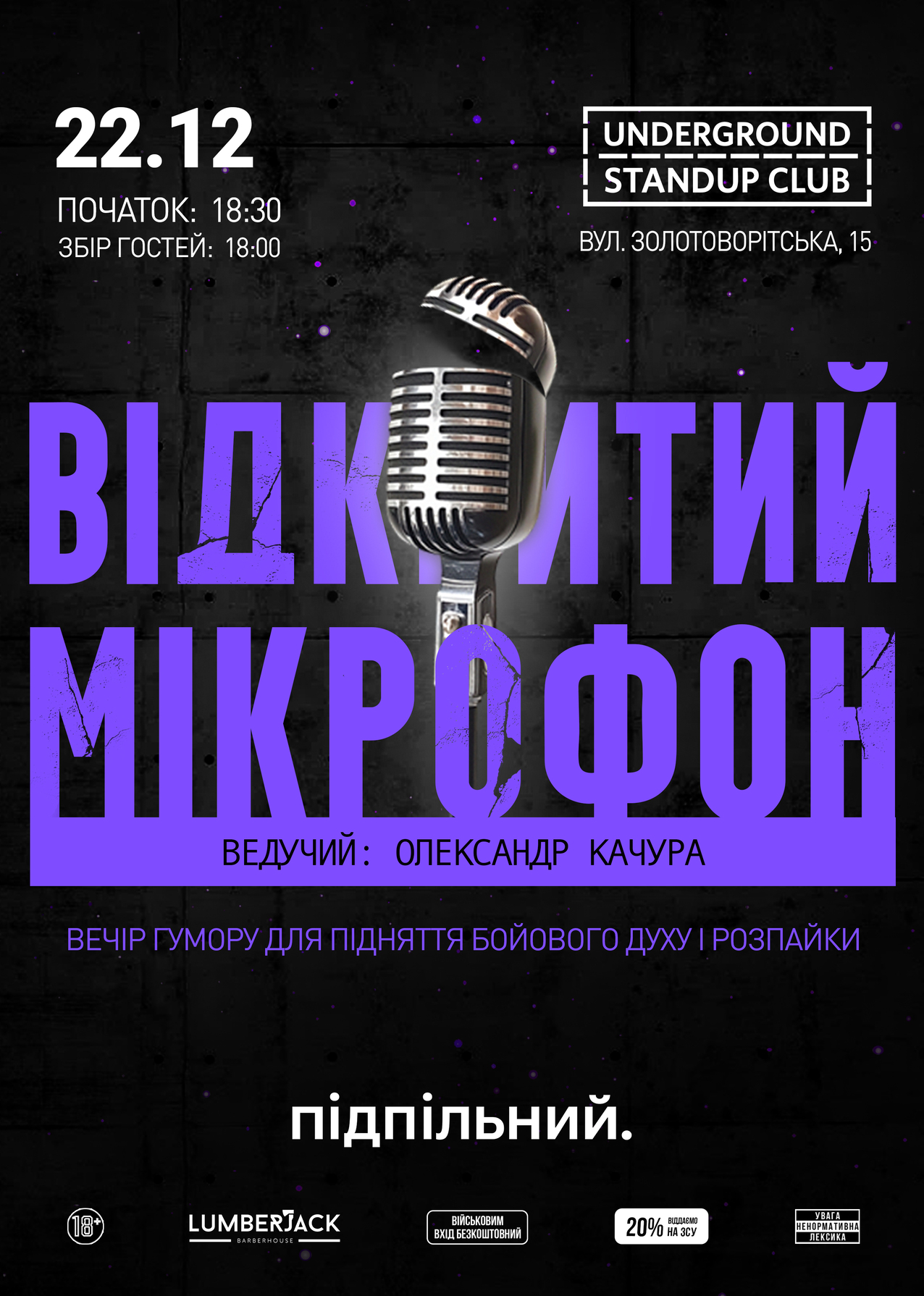 Підпільний Стендап має свій підхід до комедії. Особливі локації та формати, ексклюзивний матеріал від українських стендап коміків, що «не покажуть по ТБ». З кожного концерту передаємо від 20% на потреби ЗСУ та влаштовуємо благодійні заходи.