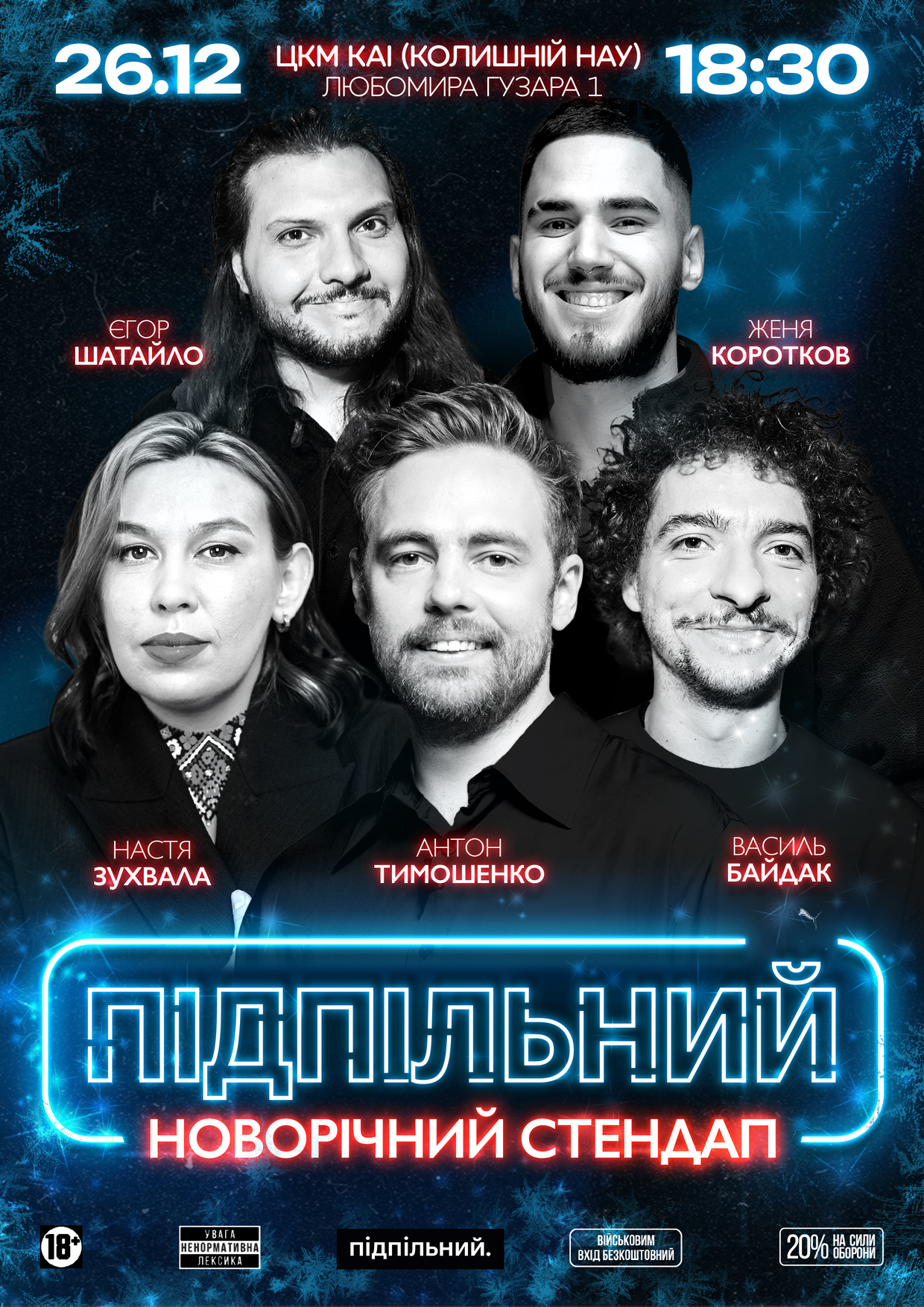 Актуальний склад коміків завжди зазначений на афіші та в описі до концерту. Щоб бути в курсі актуальних змін у лайнапі, рекомендуємо підписатись на сторінку «Підпільний Стендап» в Інстаграм.